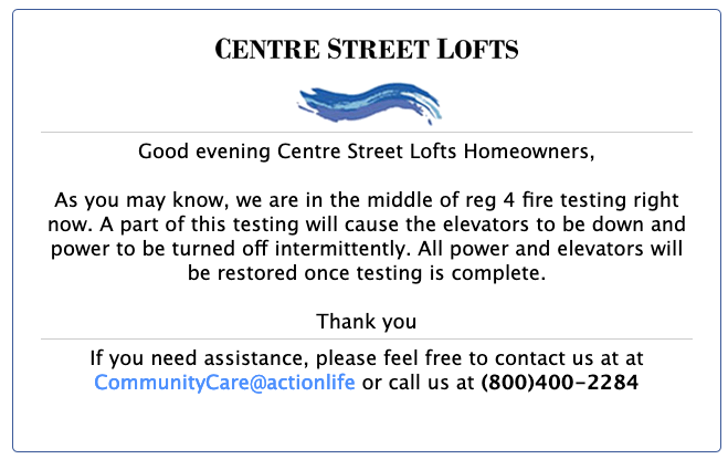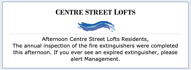 In October of 2018, it was pointed out to the building manager - Michelle Anderson - that the fire extinguishers in the building were going to need to need their annual inspection by the first week in November so that we were not in violation of state safety regulations. Since the building was already on probation with the city this was not an inspection we wanted to miss. Action didn't make the call to the vendor to do the inspection till December 21, 2018. After the inspection was complete, Action emailed the building residents: