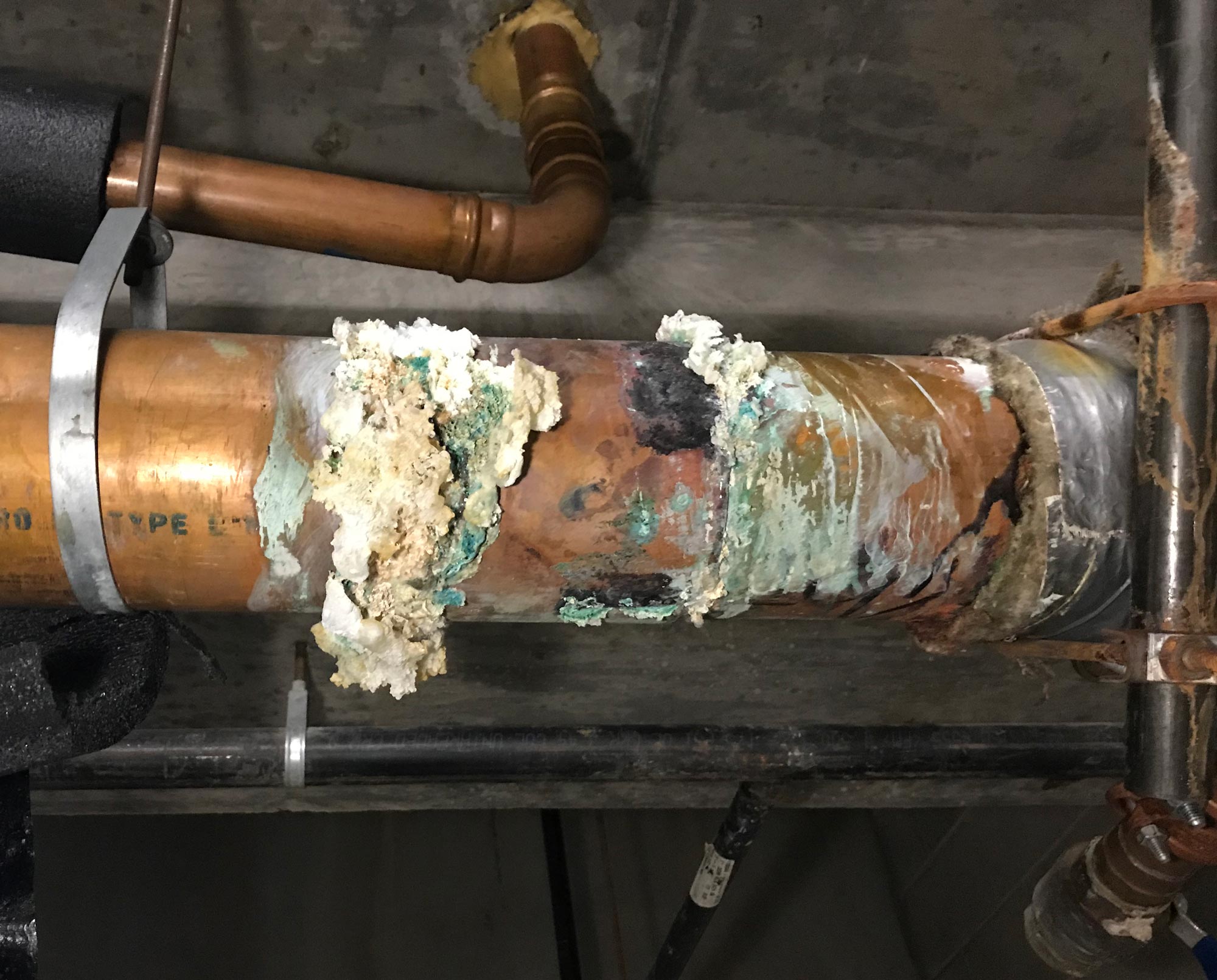 Of the three plumbers that showed up to the repair job, I was told that two had no experience with 5 in pipe. They had not brought a ladder tall enough to safely work on the overhead pipe, nor did they have the tools to properly cut out the old sections (watching them beat on a partially cut pipe with a mallet to finish the cut was quite telling). To add to this, they were unprepared to completely drain all the up-stream water in the system, and ended up trying to solder several joints with water in the pipe.