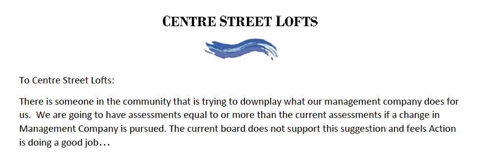 One of the large ventilation fans that is part of our garage ventilation system started making an enormous amount of noise when it was running… loud enough that a resident on an upper floor could hear it in their unit. I reported this to Action numerous times for almost a year, yet it continued unabated. Action claimed they were sending work orders to our maintenance company about the issue, but when I spoke directly to the maintenance person, he said that the orders had never been passed on to him. I obtained one of the emails Action sent to our maintenance company about the issue, and discovered that the address they were using was not valid. Apparently multiple work orders for the same issue and no response from the vendor didn't create any interest on Action’s part, and it took a resident to track down the problem and solve it for them.